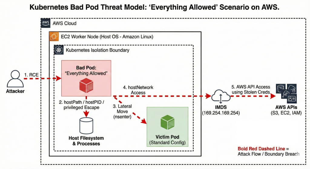 We have demonstrated how Bad Pod #1 with everything allowed can lead to complete compromise of both the Kubernetes node and the underlying AWS account. The combination of privileged: true, hostPath: /, hostNetwork: true, and hostPID: true dissolved every security boundary that Kubernetes provides. We successfully escaped the container to gain root access on the host node, moved laterally to access other pods running on the same node, and escalated to the cloud by stealing IAM credentials from the metadata service.