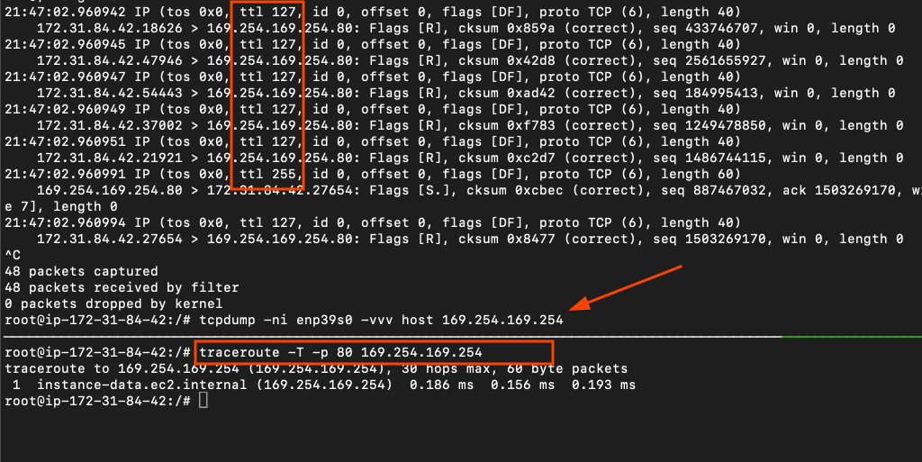 IMDS enforces the hop limit using the packet’s IP TTL (Time To Live). We verified this by capturing traffic from inside the pod and observing that requests to IMDS arrive with an intact TTL, indicating no extra L3 hop. Because the request appears to originate from the instance itself, a hop limit of 1 does not block access.